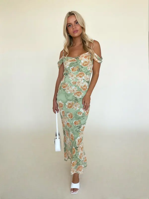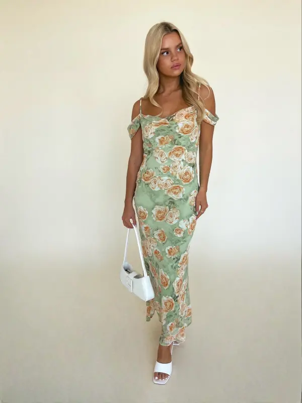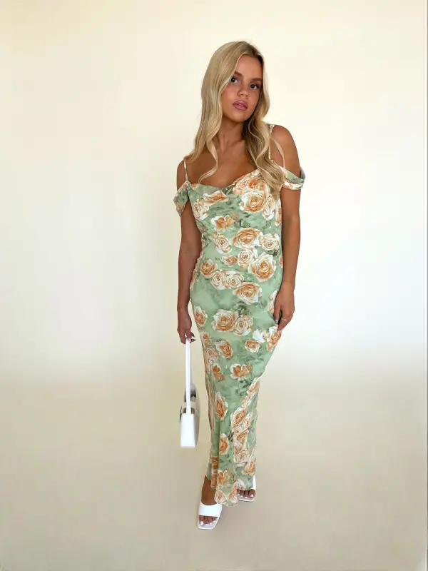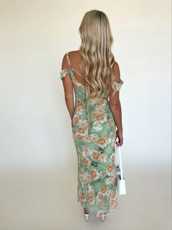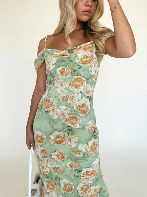 Our Carina Floral Midi Dress is a fitted floral midi dress that would be perfect for any of your upcoming events. This dress features a cowl neckline, adjustable spaghetti straps, and off the shoulder detail. The bodice of dress features a fit and flare silouette and hidden side zipper. This dress is completed with a beautiful oversized floral print all throughout. The inside of this dress is fully LINED!