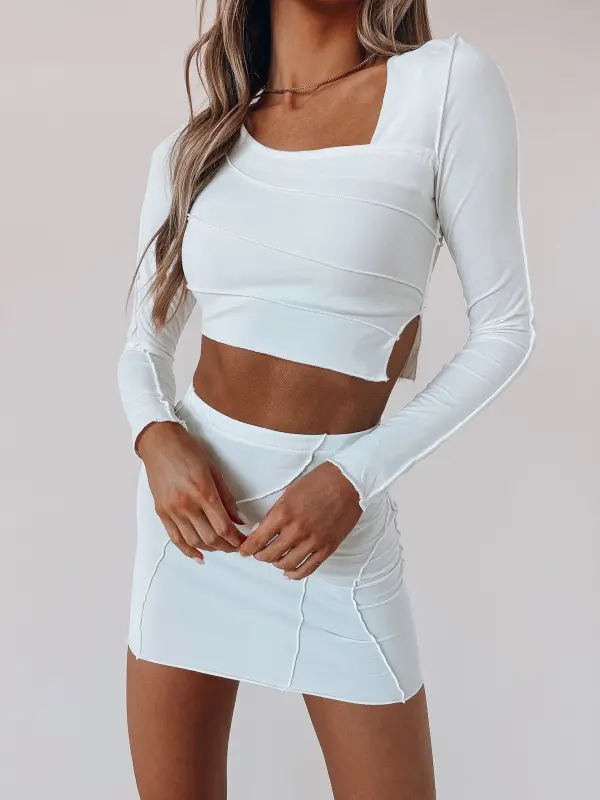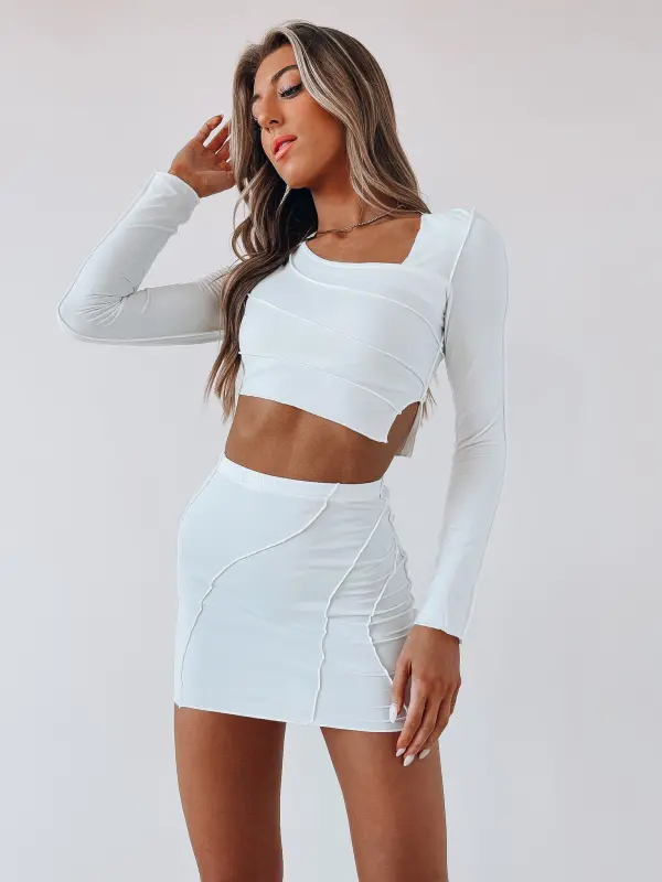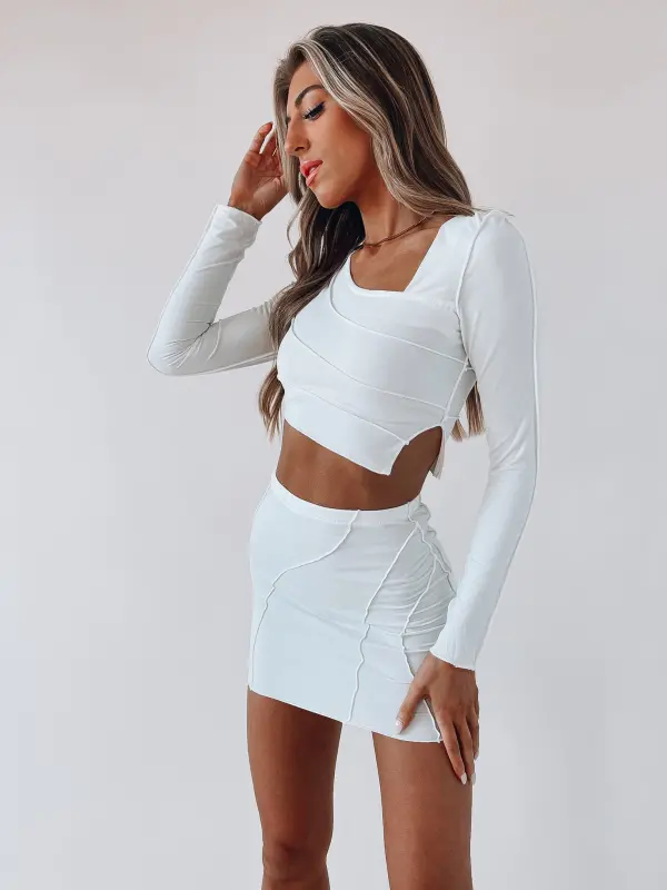 Our Lisandra Cropped Mini Skirt Set is an all-white set. This set has an asymmetrical neckline with seam detail on both the top and skirt. The top has a slight side slit.