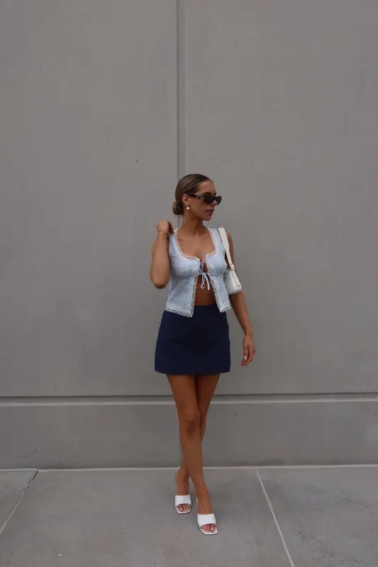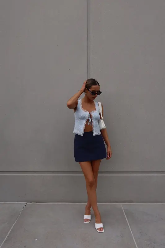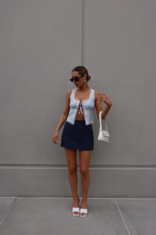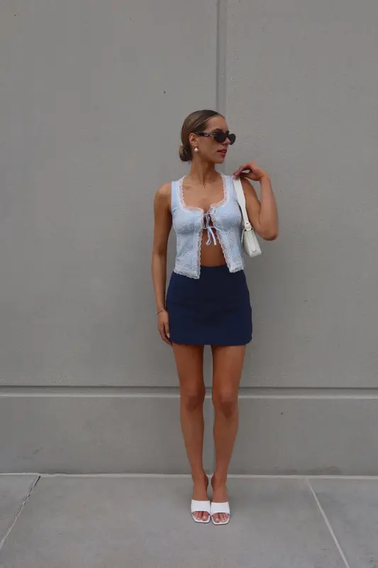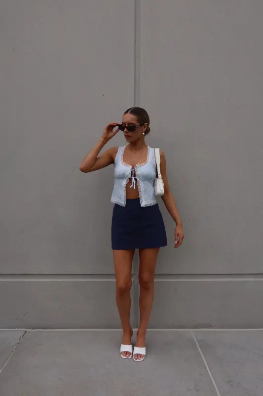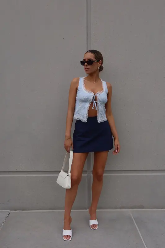 Introducing our enchanting Mandy Lace Embroidered Top, a captivating blend of blue and white hues that exudes elegance and charm. This open-front top is adorned with intricate lace trim along the neckline and hemlines, adding a touch of sophistication to its design. Featuring two ties across the bust and thick tank straps, it offers both style and functionality. Delicately embroidered with eyelet floral details throughout, this top boasts a whimsical allure that enhances its overall appeal. With its open-front style, it ensures ample movement, making it a versatile and eye-catching addition to your wardrobe.