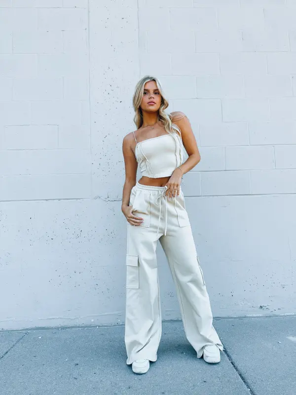 Our Noah Cotton Corset Top is a cropped corset top that is completed with a trendy rounded hemline. This top features stretchy spaghetti straps , exposed seam detail throughout the front of the top, and monochromatic exposed zipper closure in the back. This top is soft to the touch and has some stretch throughout.
