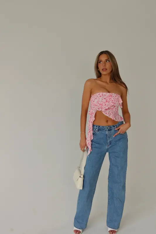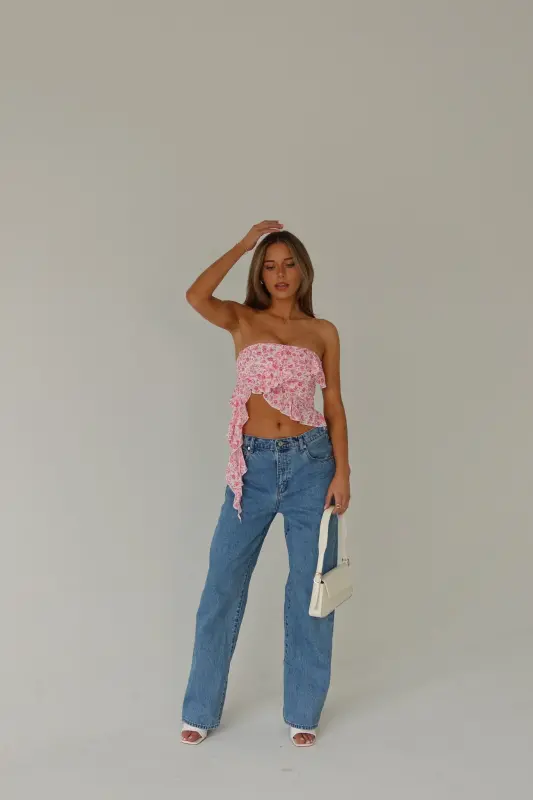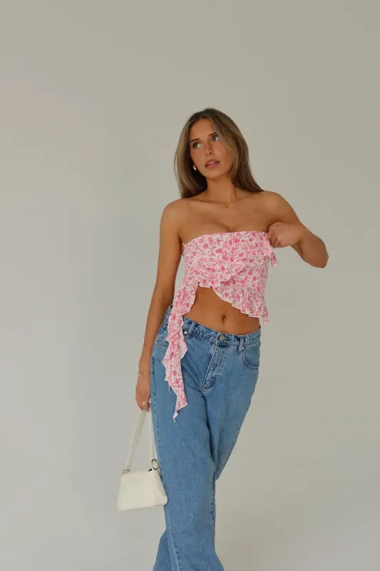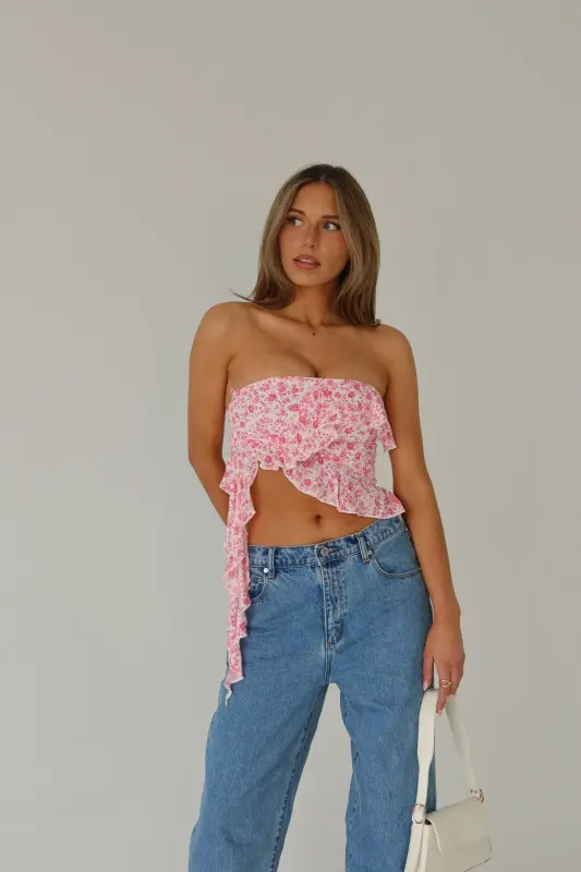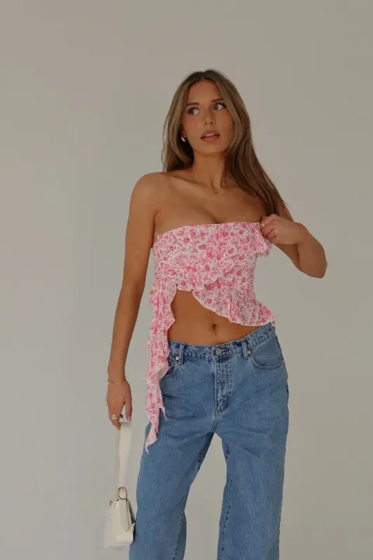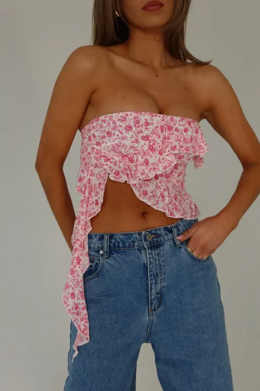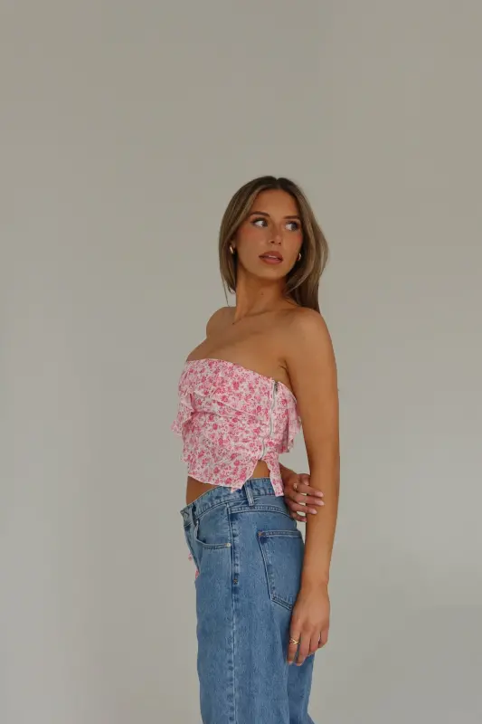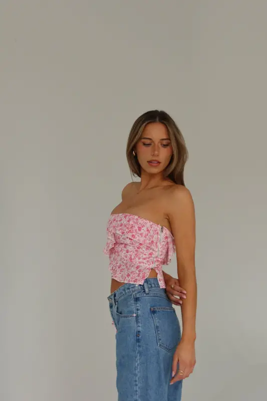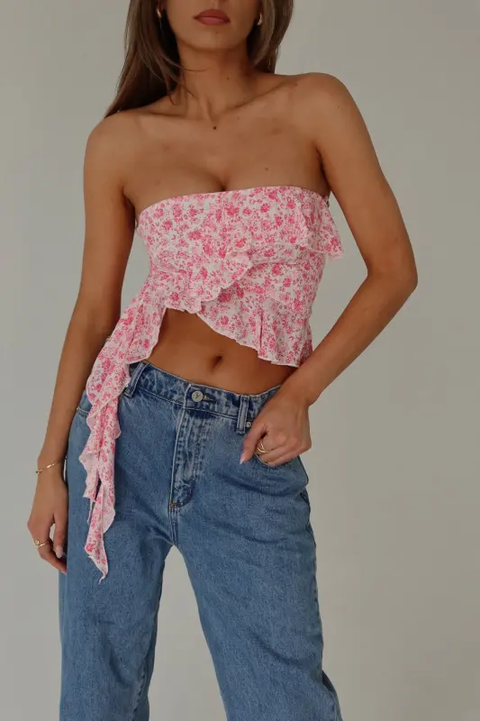 This standout piece boasts playful and flirty ruffle details adorning the neckline, hemline, and sides, adding a touch of whimsy to your ensemble. Not your average top, the Zoey Pink Floral Strapless Top features an asymmetrical hemline and a charming ruffled fabric draping gracefully off the side for added flair. This fabric is adorned with pink floral details all throughout. Complete with a convenient side zipper and a captivating crisscross ruffled fabric back, this top exudes unique style and sophistication. Make a statement with the Zoey Pink Floral Strapless Top and stand out from the crowd.