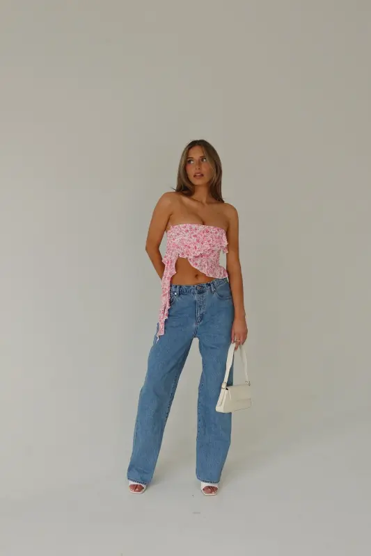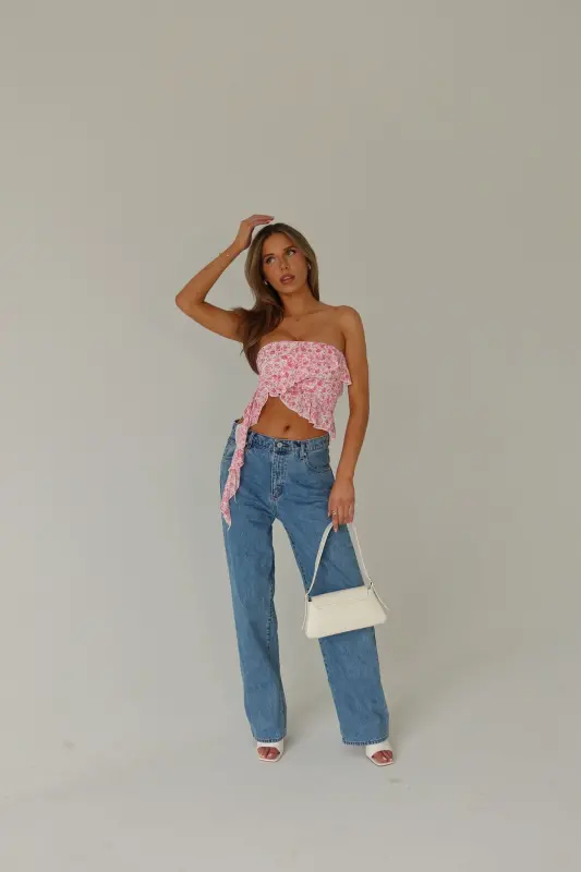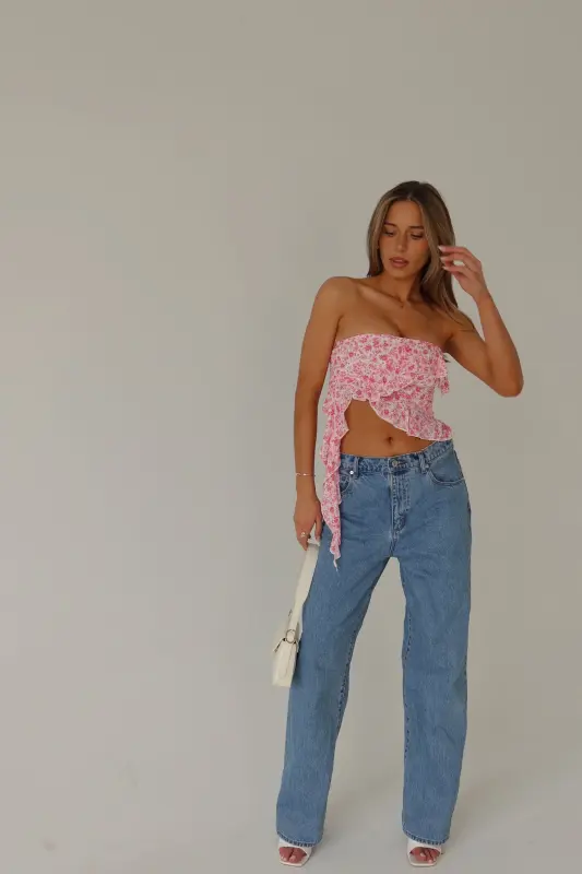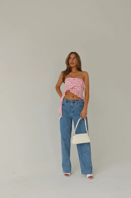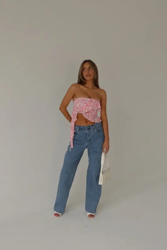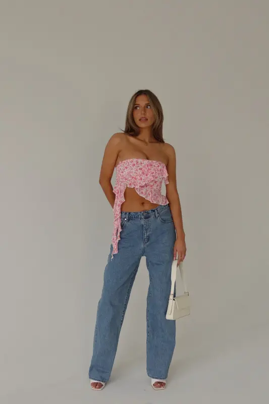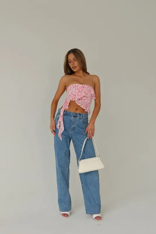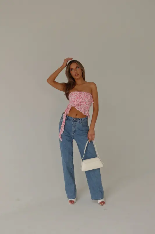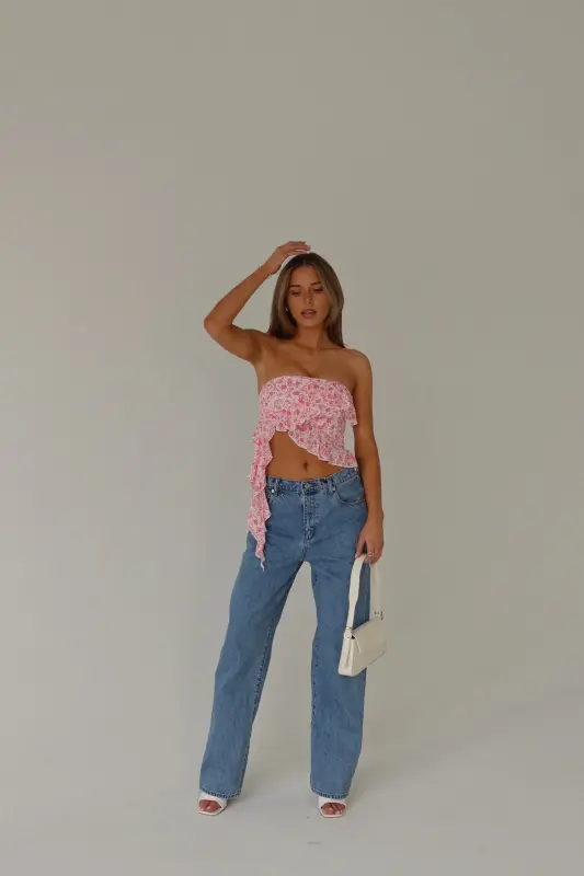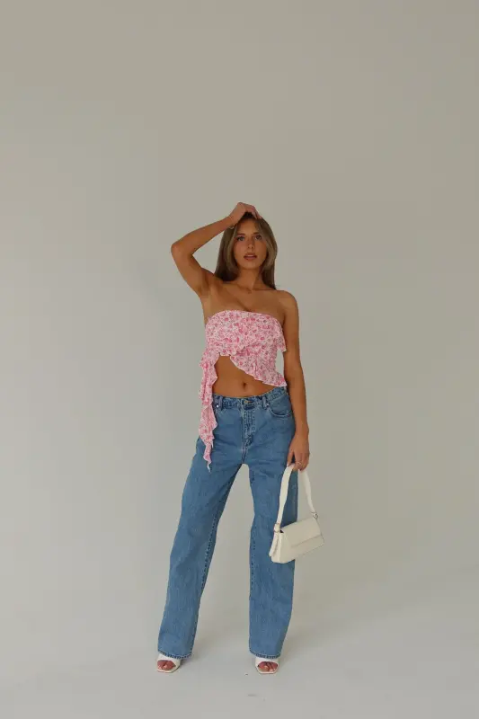 This standout piece boasts playful and flirty ruffle details adorning the neckline, hemline, and sides, adding a touch of whimsy to your ensemble. Not your average top, the Zoey Pink Floral Strapless Top features an asymmetrical hemline and a charming ruffled fabric draping gracefully off the side for added flair. This fabric is adorned with pink floral details all throughout. Complete with a convenient side zipper and a captivating crisscross ruffled fabric back, this top exudes unique style and sophistication. Make a statement with the Zoey Pink Floral Strapless Top and stand out from the crowd.